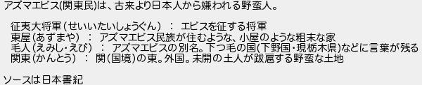 アズマエビス関東民は古来より日本人から嫌われる野蛮人 征夷大将軍せいいたいしょうぐん エビスを征する将軍 東屋あずまや アズマエビス民族が住むような小屋のような粗末な家 毛人えみしえび アズマエビスの別名下つ毛の国下野国現栃木県などに言葉が残る 関東かんとう 関国境の東外国未開の土人がする野蛮な土地 ソースは日本書紀
