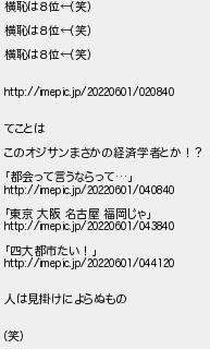 653: (SB-Android) [sage] 2022/06/01(水) 06:16:06 ID:TFjoqoxC 横恥は8位←(笑) 横恥は8位←(笑) 横恥は8位←(笑) http://imepic.jp/20220601/020840 てことは このオジサンまさかの経済学者とか!? 「都会って言うならって…」 http://imepic.jp/20220601/040840 「東京 大阪 名古屋 福岡じゃ」 http://imepic.jp/20220601/043840 「四大都市たい!」 http://imepic.jp/20220601/044120 人は見掛けによらぬもの (笑) http://egg.5ch.net/test/read.cgi/develop/1642588980/653