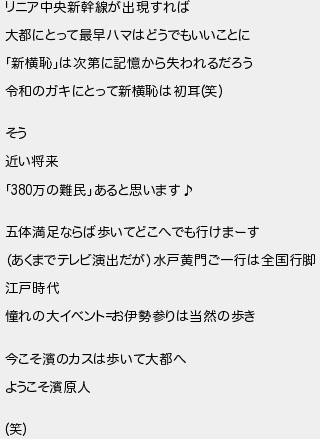 リニア中央新幹線が出現すれば 大都にとって最早ハマはどうでもいいことに 新横恥は次第に記憶から失われるだろう 令和のガキにとって新横恥は初耳笑 そう 近い将来 万の難民あると思います 五体満足ならば歩いてどこへでも行けまーす あくまでテレビ演出だが水戸黄門ご一行は全国行脚 江戸時代 憧れの大イベントお伊勢参りは当然の歩き 今こそのカスは歩いて大都へ ようこそ原人 笑