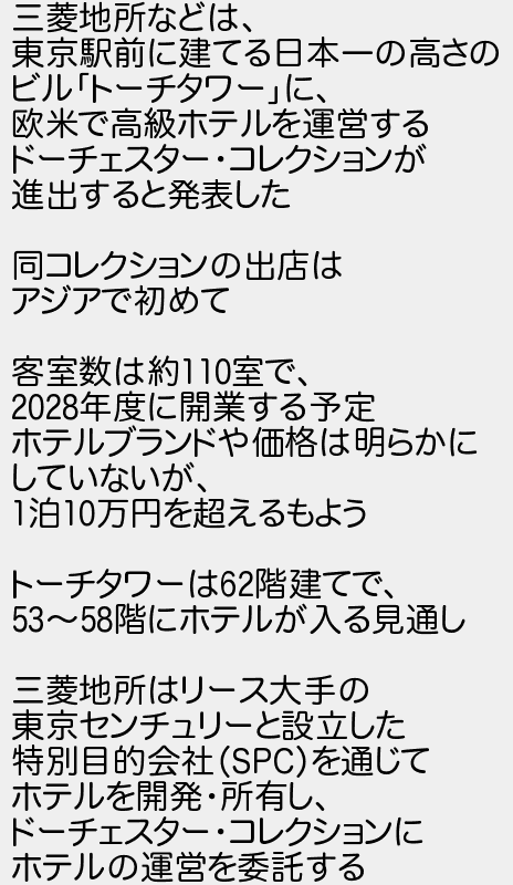 三菱地所などは 東京駅前に建てる日本一の高さの ビルトーチタワーに 欧米で高級ホテルを運営する ドーチェスターコレクションが 進出すると発表した 同コレクションの出店は アジアで初めて 客室数は約室で 年度に開業する予定 ホテルブランドや価格は明らかに していないが 泊万円を超えるもよう トーチタワーは階建てで 階にホテルが入る見通し 三菱地所はリース大手の 東京センチュリーと設立した 特別目的会社を通じて ホテルを開発所有し ドーチェスターコレクションに ホテルの運営を委託する