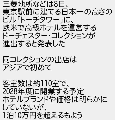 三菱地所などは日 東京駅前に建てる日本一の高さの ビルトーチタワーに 欧米で高級ホテルを運営する ドーチェスターコレクションが 進出すると発表した 同コレクションの出店は アジアで初めて 客室数は約室で 年度に開業する予定 ホテルブランドや価格は明らかに していないが 泊万円を超えるもよう