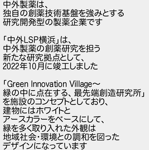 中外製薬は 独自の創薬技術基盤を強みとする 研究開発型の製薬企業です 中外横浜は 中外製薬の創薬研究を担う 新たな研究拠点として 年月に竣工しました 緑の中に点在する最先端創造研究所 を施設のコンセプトとしており 建物にはホワイトと アースカラーをベースにして 緑を多く取り入れた外観は 地域社会環境との調和を図った デザインになっています