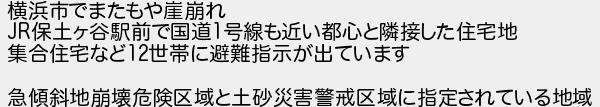 横浜市でまたもや崖崩れ 保土ヶ谷駅前で国道号線も近い都心と隣接した住宅地 集合住宅など世帯に避難指示が出ています 急傾斜地崩壊危険区域と土砂災害警戒区域に指定されている地域