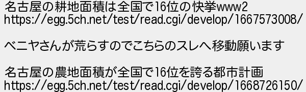 36: (茸) [sage] 2022/11/18(金) 08:04:08.11 ID:qqM5vNPM 名古屋の耕地面積は全国で16位の快挙www2 https://egg.5ch.net/test/read.cgi/develop/1667573008/ ベニヤさんが荒らすのでこちらのスレへ移動願います 名古屋の農地面積が全国で16位を誇る都市計画 https://egg.5ch.net/test/read.cgi/develop/1668726150/ http://egg.5ch.net/test/read.cgi/develop/1668302213/36