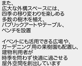 また 広大な外構スペースには 四季の移り変わりを楽しめる 多数の樹木を植え パブリックアートやテーブル ベンチを設置 イベントにも活用できる広場や ガーデニング用の果樹園も配置し 建物利用者が 時季を問わず快適に過ごせる 屋外空間を創出しています