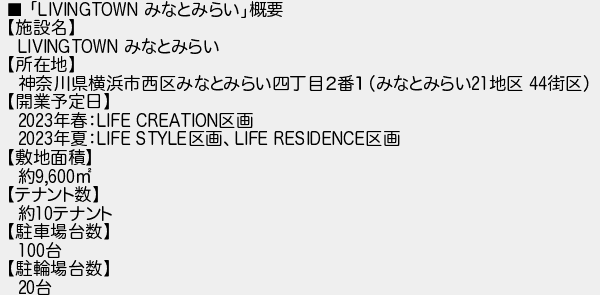 94: (ジパング) [sage] 2022/12/10(土) 12:10:37.57 ID:BGU+OECk ■ 「LIVINGTOWN みなとみらい」概要 【施設名】 LIVINGTOWN みなとみらい 【所在地】 神奈川県横浜市西区みなとみらい四丁目2番1(みなとみらい21地区 44街区) 【開業予定日】 2023年春:LIFE CREATION区画 2023年夏:LIFE STYLE区画、LIFE RESIDENCE区画 【敷地面積】 約9,600㎡ 【テナント数】 約10テナント 【駐車場台数】 100台 【駐輪場台数】 20台 http://egg.5ch.net/test/read.cgi/develop/1668302213/94