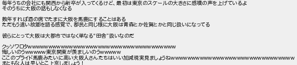 毎年うちの会社にも関西から新卒が入ってくるけど最初は東京のスケールの大きさに感嘆の声を上げているよ そのうちに大阪の話もしなくなる 数年すれば酒の席でたまに大阪を馬鹿にすることはある ただもう遠い故郷を語る感覚で都民と同じ様に大阪は青森とか佐賀とかと同じ扱いになってる 彼らにとって大阪は大都市ではなく単なる田舎扱いなのだ クッソワロタ 悔しいのう東京関東が羨ましいのう ここのプライド馬鹿みたいに高い大阪人さんたちはいい加減現実見ましょうね まともな人は早いとこ上京しましょう!