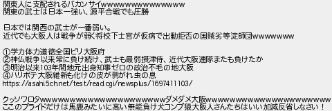関東人に支配されるバカンサイ 関東の武士は日本一強い源平合戦でも圧勝 日本では関西の武士が一番弱い 近代でも大阪人は戦争が弱く将校下士官が仮病で出動拒否の国賊劣等淀師団 学力体力道徳全国ビリ大阪府 神仏戦争以来常に負け続け武士も最弱摂津侍近代大阪連隊またも負けたか 明治以来年間地元出身知事ゼロの政治不毛の地大阪 ハリボテ大阪維新も化けの皮が剥がれ虫の息 クッソワロタダメダメ大阪 ここのプライドだけは馬鹿みたいに高い無能負け犬コンプ猿大阪人さんたちはいい加減反省しなさい!