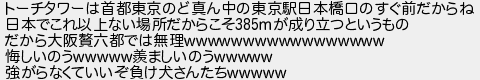 トーチタワーは首都東京のど真ん中の東京駅日本橋口のすぐ前だからね 日本でこれ以上ない場所だからこそが成り立つというもの だから大阪六都では無理 悔しいのう羨ましいのう 強がらなくていいぞ負け犬さんたち