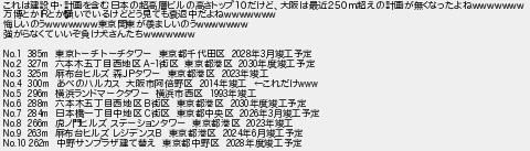402: (Unknown) [sage] 2023/11/06(月) 15:55:33.23 ID:FMOWs+wf これは建設中・計画を含む日本の超高層ビルの高さトップ10だけど、大阪は最近250m超えの計画が無くなったよねwwwwwww 万博とかIRとか騒いでいるけどどう見ても衰退中だよねwwwwwww 悔しいのうwwwwwww東京関東が羨ましいのうwwwwwww 強がらなくていいぞ負け犬さんたちwwwwwww No.1 385m 東京トーチ トーチタワー 東京都千代田区 2028年3月竣工予定 No.2 327m 六本木五丁目西地区 A-1街区 東京都港区 2030年度竣工予定 No.3 325m 麻布台ヒルズ 森JPタワー 東京都港区 2023年竣工 No.4 300m あべのハルカス 大阪市阿倍野区 2014年竣工 ←これだけwww No.5 296m 横浜ランドマークタワー 横浜市西区 1993年竣工 No.6 288m 六本木五丁目西地区 B街区 東京都港区 2030年度竣工予定 No.7 284m 日本橋一丁目中地区 C街区 東京都中央区 2026年3月竣工予定 No.8 266m 虎ノ門ヒルズ ステーションタワー 東京都港区 2023年竣工 No.9 263m 麻布台ヒルズ レジデンスB 東京都港区 2024年6月竣工予定 No.10 262m 中野サンプラザ建て替え 東京都中野区 2028年度竣工予定 http://egg.5ch.net/test/read.cgi/develop/1698965636/402