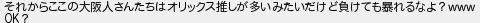 それからここの大阪人さんたちはオリックス推しが多いみたいだけど負けても暴れるなよ? ?