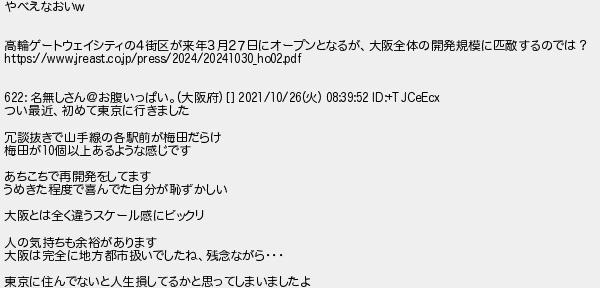 173: (東京都) [] 2025/01/05(日) 15:38:02.73 ID:2nOYWCL8 やべえなおいw 高輪ゲートウェイシティの4街区が来年3月27日にオープンとなるが、大阪全体の開発規模に匹敵するのでは? https://www.jreast.co.jp/press/2024/20241030_ho02.pdf 622: 名無しさん@お腹いっぱい。(大阪府) [] 2021/10/26(火) 08:39:52 ID:+TJCeEcx つい最近、初めて東京に行きました 冗談抜きで山手線の各駅前が梅田だらけ 梅田が10個以上あるような感じです あちこちで再開発をしてます うめきた程度で喜んでた自分が恥ずかしい 大阪とは全く違うスケール感にビックリ 人の気持ちも余裕があります 大阪は完全に地方都市扱いでしたね、残念ながら・・・ 東京に住んでないと人生損してるかと思ってしまいましたよ http://egg.5ch.net/test/read.cgi/develop/1735982521/173