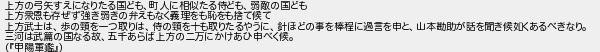 上方の弓矢すえになりたる国ども町人に相似たる侍ども弱敵の国ども 上方衆恩も存ぜず強き弱きの弁えもなく義理をも恥をも捨て候て 上方武士は歩のを一つ取りは侍のを十も取りたるやうに針ほどの事を棒程に過言を申と山本勘助が話を聞き候如くあるべきなり 三河は武篇の国なる故五千あらば上方の二万にかけあひ申べく候 甲陽軍鑑