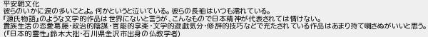 平安朝文化 彼らのいかに涙の多いことよ何かというと泣いている彼らの長袖はいつも濡れている 源氏物語のような文学的作品は世界にないと言うがこんなもので日本精神が代表されては情けない 貴族生活の恋愛葛藤政治的陰謀官能的享楽文学的遊戯気分修辞的技巧などで充たされている作品はあまり持てさぬがいいと思う 日本的霊性鈴木大拙石川県金沢市出身の仏教学者