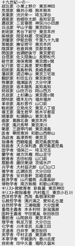 十九世紀一の 政治家 小栗上野介 東京神田 思想家 横井小楠 熊本熊本 実業家 渋沢栄一 埼玉深谷 資産家 岩崎弥太郎 高知安芸 農政家 二宮尊徳 神奈川小田原 兵法家 平山子龍 東京四谷 剣術家 男谷下総守 東京本所 探検家 間宮林蔵 茨城筑波 測量家 伊能忠敬 千葉九十九里 策略家 勝安房守 東京本所 陰謀家 岩倉具視 京都京都 開国家 岩瀬肥後守 東京愛宕 自信家 佐久間象山 長野松代 経世家 海保青陵 東京霞ヶ関 紀行家 菅江真澄 愛知豊橋 砲術家 高島秋帆 長崎長崎 藩政家 渡辺山 東京三宅坂 翻訳家 杉田玄白 東京新宿 啓蒙家 福諭吉 大分中津 遊説家 坂本龍馬 高知高知 財政家 山田方谷 岡山西方 民政家 上杉鷹山 東京霞ヶ関 開明家 橋本左内 福井福井 革命家 高杉晋作 山口萩 戦術家 立見尚文 東京八丁堀 尊王家 蒲生君平 栃木宇都宮 随筆家 松浦静山 東京浅草 画家 葛飾北斎 東京本所 作家 滝沢馬琴 東京深川 噺家 三遊亭円朝 東京湯島 医者 華岡青洲 和歌山西野山 為政者 島津斉彬 東京芝 指導者 西郷隆盛 鹿児島鹿児島 独裁者 大久保利通 鹿児島鹿児島 国学者 塙保己一 埼玉児玉 蘭学者 緒方洪庵 岡山足守 教育者 吉田松陰 山口萩 扇動者 藤田東湖 茨城水戸 兵学者 大村益次郎 山口山口 儒学者 広瀬淡窓 大分日田 漢学者 安井息軒 宮崎宮崎 経済学者 山片桃 兵庫高砂 博物学者 南方熊楠 和歌山和歌山 キリスト教教育者 新島 東京神田 キリスト教指導者 内村鑑三 東京小石川 西洋哲学者 西周 島根津和野 仏教哲学者 清沢満之 愛知名古屋 自然哲学者 三浦梅園 大分国東 重商主義者 本多利明 新潟蒲原 国粋主義者 平田篤胤 秋田秋田 豪胆者 山岡鉄舟 東京本所 理学者 帆足万里 大分日出 化学者 川本幸民 兵庫三田 求道者 白井亨 東京桜田 英学者 中村正直 東京麻布 本草学者 平賀源内 香川志度 技術者 田中久重 福岡久留米