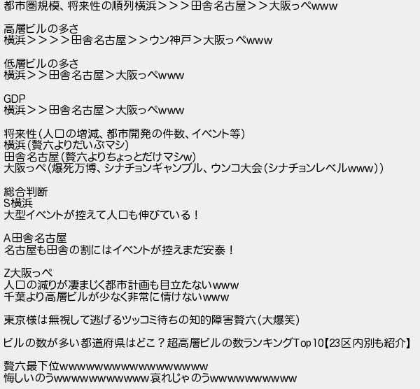 都市圏規模将来性の順列横浜田舎名古屋大阪っぺ 高層ビルの多さ 横浜田舎名古屋ウン神戸大阪っぺ 低層ビルの多さ 横浜田舎名古屋大阪っぺ 横浜田舎名古屋大阪っぺ 将来性人口の増減都市開発の件数イベント等 横浜六よりだいぶマシ 田舎名古屋六よりちょっとだけマシ 大阪っぺ爆死万博シナチョンギャンブルウンコ大会シナチョンレベル 総合判断 横浜 大型イベントが控えて人口も伸びている! 田舎名古屋 名古屋も田舎の割にはイベントが控えまだ安泰! 大阪っぺ 人口の減りが凄まじく都市計画も目立たない 千葉より高層ビルが少なく非常に情けない 東京様は無視して逃げるツッコミ待ちの知的障害六大爆笑 ビルの数が多い都道府県はどこ?超高層ビルの数ランキング区内別も紹介 六最下位 悔しいのう哀れじゃのう