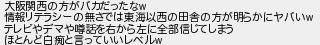 大阪関西の方がバカだったな 情報リテラシーの無さでは東海以西の田舎の方が明らかにヤバい テレビやデマや噂話を右から左に全部信じてしまう ほとんど白痴と言っていいレベル