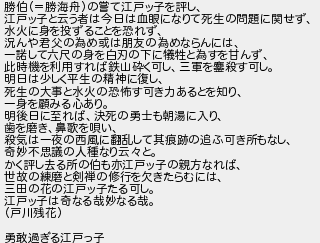勝伯勝海舟の嘗て江戸ッ子を評し 江戸ッ子と云う者は今日は血眼になりて死生の問題に関せず 水火に身を投ずることを恐れず 況んや君父の為め或は朋友の為めならんには 一諾して六尺の身を白刃の下に犠牲と為すを甘んず 此時機を利用すれば鉄山砕く可し三軍を殺す可し 明日は少しく平生の精神に復し 死生の大事と水火の恐怖す可き力あるとを知り 一身を顧みる心あり 明後日に至れば決死の勇士も朝湯に入り 歯を磨き鼻歌を唄い 殺気は一夜の西風に翻乱して其痕跡の追ふ可き所もなし 奇妙不思議の人種なり云と かく評し去る所の伯も亦江戸ッ子の親方なれば 世故の練磨と剣禅の修行を欠きたらむには 三田の花の江戸ッ子たる可し 江戸ッ子は奇なる哉妙なる哉 戸川残花 勇敢過ぎる江戸っ子
