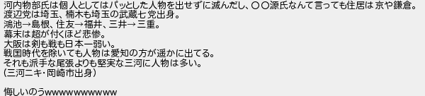 河内物部氏は個人としてはパッとした人物を出せずに滅んだし源氏なんて言っても住居は京や鎌倉 渡辺党は埼玉楠木も埼玉の武蔵七党出身 鴻池島根住友福井三井三重 幕末は超が付くほど悲惨 大阪は剣も戦も日本一弱い 戦国時代を除いても人物は愛知の方が遥かに出てる それも派手な尾張よりも堅実な三河に人物は多い 三河ニキ岡崎市出身 悔しいのう