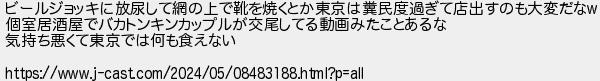 179: (やわらか銀行) [] 2026/02/12(木) 19:14:43.59 ID:EjHP4RwS ビールジョッキに放尿して網の上で靴を焼くとか東京は糞民度過ぎて店出すのも大変だなw 個室居酒屋でバカトンキンカップルが交尾してる動画みたことあるな 気持ち悪くて東京では何も食えない https://www.j-cast.com/2024/05/08483188.html?p=all http://egg.5ch.net/test/read.cgi/develop/1769856442/179