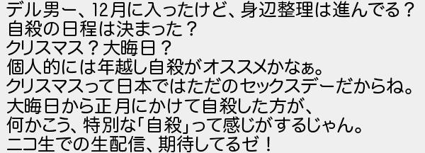 デル男ー月に入ったけど身辺整理は進んでる? 自殺の日程は決まった? クリスマス?大晦日? 個人的には年越し自殺がオススメかなぁ クリスマスって日本ではただのセックスデーだからね 大晦日から正月にかけて自殺した方が 何かこう特別な自殺って感じがするじゃん ニコ生での生配信期待してるゼ!