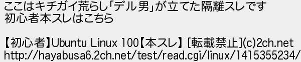 223: [sage] 2015/02/10(火) 11:59:12.21 ID:oxZUgE7x ここはキチガイ荒らし「デル男」が立てた隔離スレです 初心者本スレはこちら 【初心者】Ubuntu Linux 100【本スレ】 [転載禁止](c)2ch.net http://hayabusa6.2ch.net/test/read.cgi/linux/1415355234/ http://mao.5ch.net/test/read.cgi/linux/1414908708/223