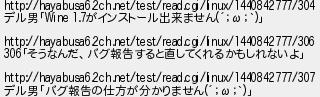 288: [sage] 2015/10/10(土) 02:10:03.74 ID:6pphQM0d http://hayabusa6.2ch.net/test/read.cgi/linux/1440842777/304 デル男「Wine 1.7がインストール出来ません(´;ω;`)」 http://hayabusa6.2ch.net/test/read.cgi/linux/1440842777/306 306「そうなんだ、バグ報告すると直してくれるかもしれないよ」 http://hayabusa6.2ch.net/test/read.cgi/linux/1440842777/307 デル男「バグ報告の仕方が分かりません(´;ω;`)」 http://mao.5ch.net/test/read.cgi/linux/1414908708/288