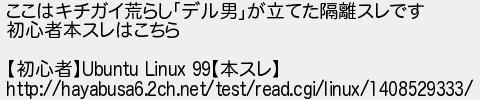 2: [sage] 2014/11/02(日) 15:35:46.73 ID:H3Bk5o7n ここはキチガイ荒らし「デル男」が立てた隔離スレです 初心者本スレはこちら 【初心者】Ubuntu Linux 99【本スレ】 http://hayabusa6.2ch.net/test/read.cgi/linux/1408529333/ http://mao.5ch.net/test/read.cgi/linux/1414908708/2