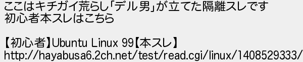 2: [sage] 2014/11/02(日) 15:35:46.73 ID:H3Bk5o7n ここはキチガイ荒らし「デル男」が立てた隔離スレです 初心者本スレはこちら 【初心者】Ubuntu Linux 99【本スレ】 http://hayabusa6.2ch.net/test/read.cgi/linux/1408529333/ http://mao.5ch.net/test/read.cgi/linux/1414908708/2