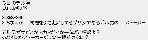 今日のデル男 おまえが 問題を引き起こしてるブサ女であるデル男の ストーカー デル男が女だとかネカマだとか一体どこ情報よ? あとオレがストーカーだっつー根拠はなに?