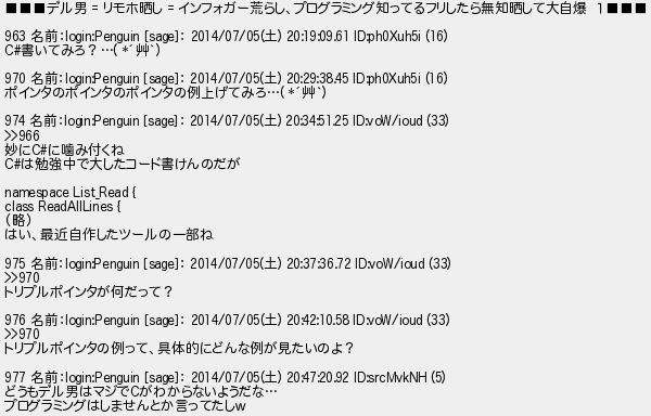 38: [sage] 2014/11/02(日) 20:03:22.24 ID:R1CTK5VK ■■■デル男 = リモホ晒し = インフォガー荒らし、プログラミング知ってるフリしたら無知晒して大自爆 1■■■ 963 名前:login:Penguin [sage]: 2014/07/05(土) 20:19:09.61 ID:ph0Xuh5i (16) C#書いてみろ?…( *´艸`) 970 名前:login:Penguin [sage]: 2014/07/05(土) 20:29:38.45 ID:ph0Xuh5i (16) ポインタのポインタのポインタの例上げてみろ…( *´艸`) 974 名前:login:Penguin [sage]: 2014/07/05(土) 20:34:51.25 ID:voW/ioud (33) >>966 妙にC#に噛み付くね C#は勉強中で大したコード書けんのだが namespace List_Read { class ReadAllLines { (略) はい、最近自作したツールの一部ね 975 名前:login:Penguin [sage]: 2014/07/05(土) 20:37:36.72 ID:voW/ioud (33) >>970 トリプルポインタが何だって? 976 名前:login:Penguin [sage]: 2014/07/05(土) 20:42:10.58 ID:voW/ioud (33) >>970 トリプルポインタの例って、具体的にどんな例が見たいのよ? 977 名前:login:Penguin [sage]: 2014/07/05(土) 20:47:20.92 ID:srcMvkNH (5) どうもデル男はマジでCがわからないようだな… プログラミングはしませんとか言ってたしw http://mao.5ch.net/test/read.cgi/linux/1414908708/38