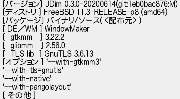 653: [sage] 2020/06/18(木) 00:23:22 ID:eQbc6oiu [バージョン] JDim 0.3.0-20200614(git:1eb0bac876:M) [ディストリ ] FreeBSD 11.3-RELEASE-p8 (amd64) [パッケージ] バイナリ/ソース( <配布元> ) [ DE/WM ] WindowMaker [ gtkmm ] 3.22.2 [ glibmm ] 2.56.0 [ TLS lib ] GnuTLS 3.6.13 [オプション ] '--with-gtkmm3' '--with-tls=gnutls' '--with-native' '--with-pangolayout' [ その他 ] http://mao.5ch.net/test/read.cgi/linux/1584619744/653