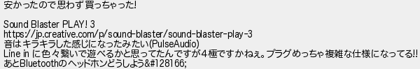 369: [] 2022/02/18(金) 20:11:26.95 ID:meJFccEx 安かったので思わず買っちゃった! Sound Blaster PLAY! 3 https://jp.creative.com/p/sound-blaster/sound-blaster-play-3 音はキラキラした感じになったみたい(PulseAudio) Line in に色々繋いで遊べるかと思ってたんですが4極ですかねぇ。プラグめっちゃ複雑な仕様になってる!! あとBluetoothのヘッドホンどうしよう💦 http://mao.5ch.net/test/read.cgi/linux/1620213913/369