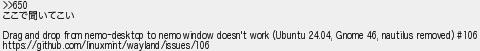 653: [] 2025/08/26(火) 13:28:46.28 ID:aMrWoOkB >>650 ここで聞いてこい Drag and drop from nemo-desktop to nemo window doesn't work (Ubuntu 24.04, Gnome 46, nautilus removed) #106 https://github.com/linuxmint/wayland/issues/106 http://mao.5ch.net/test/read.cgi/linux/1728346200/653