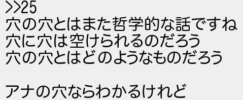 31: (ワッチョイ b757-3f+z) [sage] 2024/11/27(水) 01:15:25.95 ID:gZXxQe9v0 >>25 穴の穴とはまた哲学的な話ですね 穴に穴は空けられるのだろう 穴の穴とはどのようなものだろう アナの穴ならわかるけれど http://medaka.5ch.net/test/read.cgi/part/1732607222/31