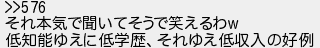 それ本気で聞いてそうで笑えるわ 低知能ゆえに低学歴それゆえ低収入の好例