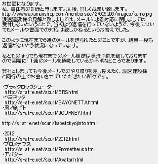 167: [] 2014/10/18(土) 13:39:25.49 ID:7o723kow お世話になります。 私、責任者の加茂と申します。以後、宜しくお願い致します。 http://www.apamanshop.com/membersite/27009206/images/kamo.jpg 浪速建設様の見解と致しましては、メールによる対応に関しましては 受付しないということで、当初より返信を行っていないようで、今後につい てもメールや書面での対応は致しかねるというお答えでした。 このように現在まで6通のメールを送られたとのことですが、結果一度も 返信がないとう状況になっています。 私どものほうでも現在までのメール履歴は随時削除を致しております ので実際に11通のメールを頂戴しているか不明なところであります。 弊社としましても今後メールでのやり取りを差し控えたく、浪速建設様 と同行の上でお会いさせていただきたい所存です。 ・ブラックロックシューター http://s-at-e.net/scurl/BRS.html ・ベヨネッタ http://s-at-e.net/scurl/BAYONETTA.html ・風ノ旅ビト http://s-at-e.net/scurl/JOURNEY.html http://s-at-e.net/scurl/kabetokyojinto.html ・2012 http://s-at-e.net/scurl/2012.html ・プロメテウス http://s-at-e.net/scurl/Prometheus.html ・アバター http://s-at-e.net/scurl/Avatar.html http://medaka.5ch.net/test/read.cgi/php/1069451782/167