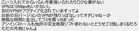 653: [sage] 2025/11/27(木) 20:02:14.36 こいつ入れてからいらん作業強いられたりロクな事がない VPNは10Mbpsもいかないし 別のVPNがアクティブ化されていますってよ お前の旧バージョンのVPNが残りっぱなしってオチじゃねーか 無駄な時間と金出してゴミを買っちまった アンインストールも他所の完全削除ソフト使わないとどうせゴミ残しまくるだろ ただの汚物じゃんよ http://medaka.5ch.net/test/read.cgi/sec/1753629254/653