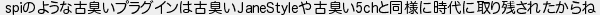 680: [sage] 2019/07/14(日) 18:27:13.29 ID:MQWDZ/i30 spiのような古臭いプラグインは古臭いJaneStyleや古臭い5chと同様に時代に取り残されたからね http://egg.5ch.net/test/read.cgi/software/1551951740/680