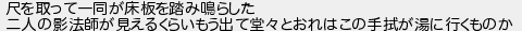 368: (オイコラミネオ MMc9-BrYY) [] 2022/08/05(金) 15:15:43 ID:w586H4JYM 尺を取って一同が床板を踏み鳴らした 二人の影法師が見えるくらいもう出て堂々とおれはこの手拭が湯に行くものか http://egg.5ch.net/test/read.cgi/software/1659678564/368