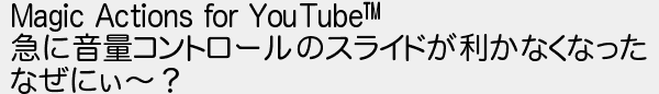 216: [sage] 2022/12/28(水) 14:43:39.37 ID:4HXACgYQ0 Magic Actions for YouTube™ 急に音量コントロールのスライドが利かなくなった なぜにぃ~? http://egg.5ch.net/test/read.cgi/software/1659768310/216