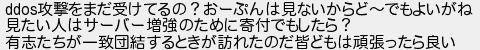 攻撃をまだ受けてるの?おーぷんは見ないからどでもよいがね 見たい人はサーバー増強のために寄付でもしたら? 有志たちが一致団結するときが訪れたのだ皆どもは頑張ったら良い