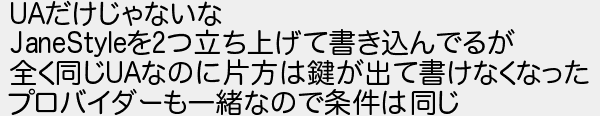 466: [sage] 2022/09/23(金) 11:51:23.23 ID:lPxs18yX0 UAだけじゃないな JaneStyleを2つ立ち上げて書き込んでるが 全く同じUAなのに片方は鍵が出て書けなくなった プロバイダーも一緒なので条件は同じ http://egg.5ch.net/test/read.cgi/software/1663503935/466