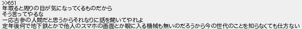 652: [sage] 2022/09/25(日) 09:09:37.13 ID:uCVHjt9H0 >>651 年取ると周りの目が気になってくるものだから そう言ってやるな 一応古参の人間だと思うからそれなりに話を聞いてやれよ 定年後何で地下鉄とかで他人のスマホの画面とか眼に入る機械も無いのだろうから今の世代のことを知らなくても仕方ない http://egg.5ch.net/test/read.cgi/software/1663503935/652