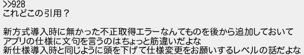 930: [sage] 2022/09/26(月) 21:21:29.45 ID:1BtZtpnW0 >>928 これどこの引用? 新方式導入時に無かった不正取得エラーなんてものを後から追加しておいて アプリの仕様に文句を言うのはちょっと筋違いだよな 新仕様導入時と同じように頭を下げて仕様変更をお願いするレベルの話だよな http://egg.5ch.net/test/read.cgi/software/1663503935/930