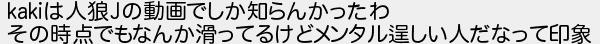 287: (ワッチョイW 4b6e-6l1J [153.173.11.9]) [sage] 2021/09/07(火) 22:42:10 ID:l/cV9/jA0 kakiは人狼Jの動画でしか知らんかったわ その時点でもなんか滑ってるけどメンタル逞しい人だなって印象 http://egg.5ch.net/test/read.cgi/streaming/1630986708/287
