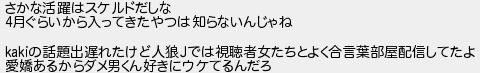 さかな活躍はスケルドだしな 月ぐらいから入ってきたやつは知らないんじゃね の話題出遅れたけど人狼では視聴者女たちとよく合言葉部屋配信してたよ 愛あるからダメ男くん好きにウケてるんだろ