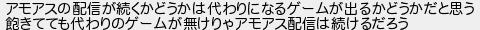 アモアスの配信が続くかどうかは代わりになるゲームが出るかどうかだと思う 飽きてても代わりのゲームが無けりゃアモアス配信は続けるだろう