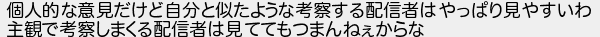 48: (ワッチョイW 65b1-y2ou [60.105.147.80]) [sage] 2021/09/07(火) 15:17:48 ID:82nMHuFu0 個人的な意見だけど自分と似たような考察する配信者はやっぱり見やすいわ 主観で考察しまくる配信者は見ててもつまんねぇからな http://egg.5ch.net/test/read.cgi/streaming/1630986708/48