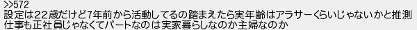 設定は22歳だけど年前から活動してるの踏まえたら実年齢はアラサーくらいじゃないかと推測 仕事も正社員じゃなくてパートなのは実家暮らしなのか主婦なのか